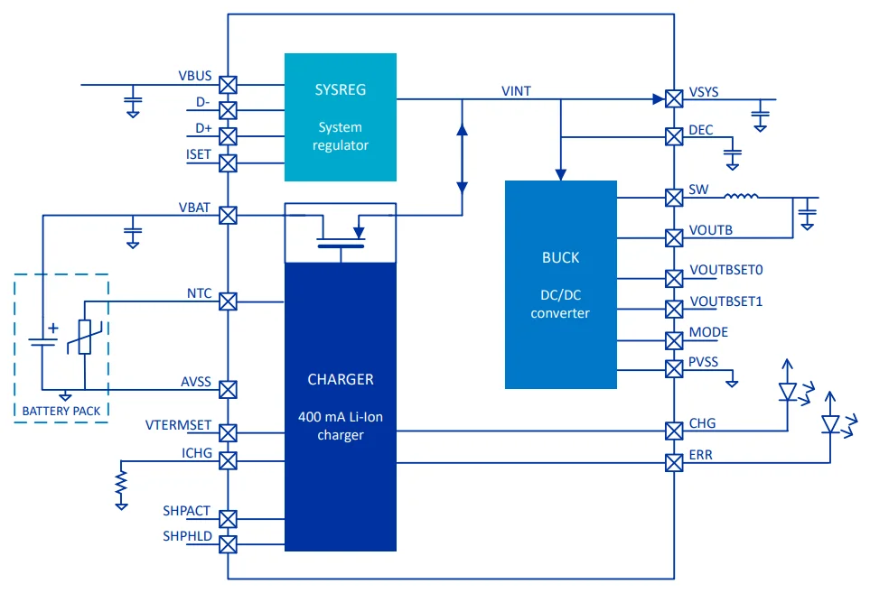 It can charge the battery from USB with a configurable charge current from 20 mA to 400 mA, and supply up to 150 mA to the downstream devices. It contains a buck converter which is efficient down to 1 uA loads (it can automatically switch between PWM and hysteretic operation modes). Typical quiescent current is 800 uA.1