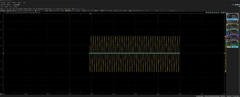 In November 2025 (this is when the software to support the Logic MSO was made completely public) Saleae also released a family of mixed oscilloscope/logic analysers called Logic MSO (mixed signal oscilloscope). They offer dedicated analogue channels with oscilloscope probe hardware. These analogue channels have a much higher bandwidth (100 or 200 MHz) and sample rate (1 or 1.6 GS/s) than the analogue channels on the Logic Pro family (which typically have a sample rate of 50 MS/s). The analogue channels can also support a much higher voltage at at the connector input, which means with the provided 10:1 probes. There are 9 and 12-bit vertical resolution options.1