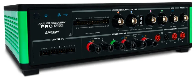 The Digilent Analog Discovery Pro is a family of mixed-signal oscilloscopes (MSOs). They feature a traditional oscilloscope, digital multimeter, programmable power supplies, waveform generator, logic analyzer data logger and general purpose I/O. The devices pair with the Waveforms GUI software to provide a complete solution for signal acquisition, analysis and control. Scripting capabilities are also available in a number of languages such as Python.