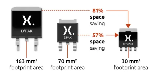 The LFPAK56 package offers significant PCB space savings compared to the DPAK/D2PAK packages, as shown in This is a placeholder for the reference: fig-dpak-d2pak-vs-lfpak56-nexperia.