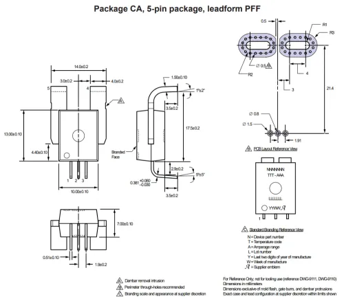 The dimensions and recommended footprint of the PFF are shown in This is a placeholder for the reference: fig-pff-leadform-dimensions.