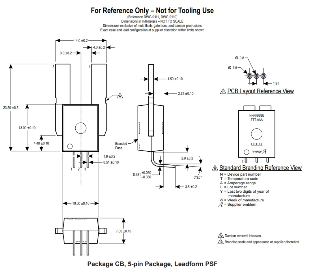 - PSF — Use when you want formed signal leads for the PCB but straight primary terminals—for example to mate with a bus bar, weld, or other mechanical arrangement on the high-current path, while still using plated through-holes for VCC, GND, and output.