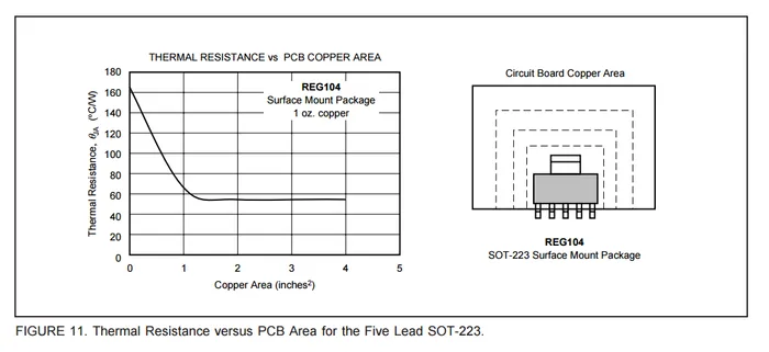Below is a graph showing the thermal resistance of the SOT-223-5 package with varying copper area.