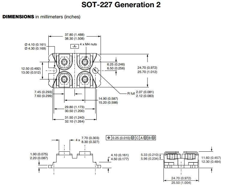 • SOT-227B: Package name used by IXYS and Littelfuse (the B might be referring to either “backside”, “bonded” or perhaps the second revision of the package, just like Vishay’s “Generation 2” dimensions).3 4
